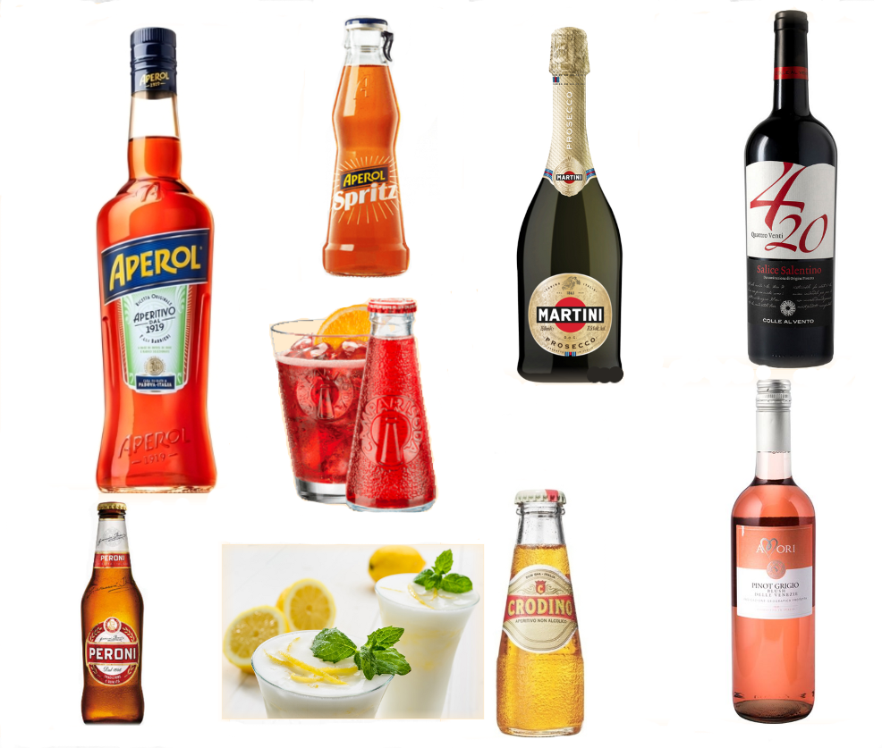 1 Aperol 700ml +3 Aperol Spritz 175ml + 1 Prosecco Martini 750ml + 1 Salice salentino 4/20 ερυθρός οίνος + 1 Pinot Grigio Rosè Blush λευκός οίνος + 5 Campari Soda 110ml + 10 Crodino 100ml +3 Birra Peroni 330ml.